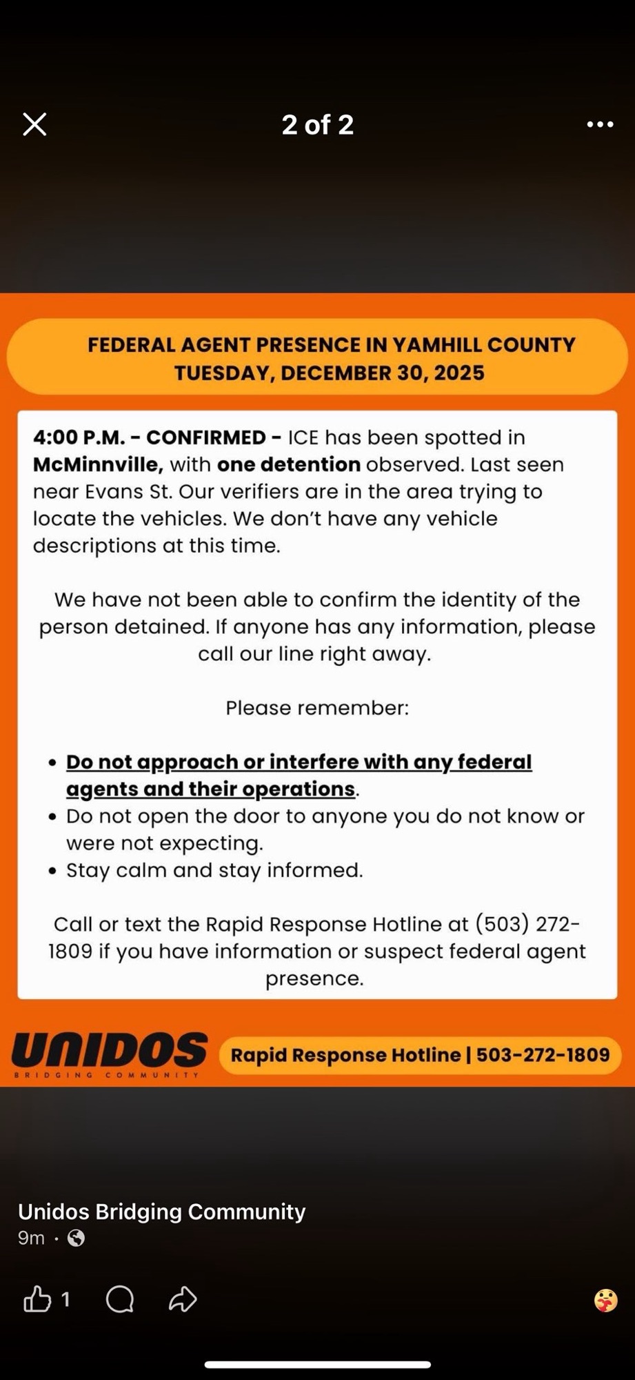 The post, shared by Unidos Bridging Community, stated that Immigration and Customs Enforcement agents had been spotted in McMinnville near Evans Street and that one detention had been observed. The alert noted that the identity of the detained individual had not been confirmed and that no vehicle descriptions were available. Members of the public were encouraged to contact a private hotline if they had information or suspected federal agent presence.